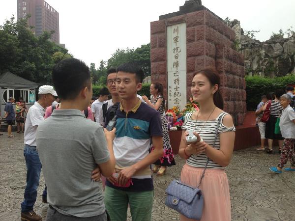 7月7日,全民族抗战爆发77周年。我校实践队员来到川军抗日阵亡将士纪念碑。该纪念碑是为了纪念在抗日战争中阵亡的60多万川军而于1944年修建的。纪念碑上一位川军士兵,穿着短裤、绑着绑腿,背着斗笠大刀、手握步枪,胸前悬挂两颗手榴弹,注视前方,就像即将冲锋的战士。实践队员们在纪念碑前用鲜花祭奠遇难同胞,感恩阵亡先烈。偶遇成都吉小宝文化艺术中心创建人吉小宝先生的个人纪念抗日英雄画展,他与实践队员亲切交谈,与我们合影留念。此次活动引起成都市广播电台的关注,记者采访了校学生会主席文章同学。