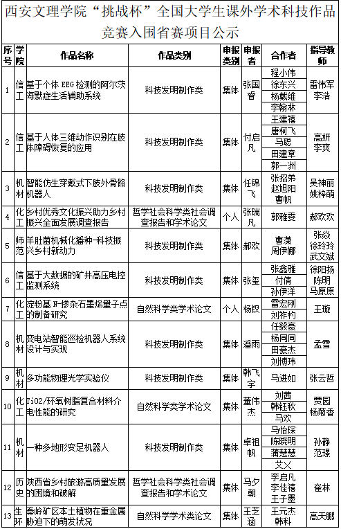 九游(中国)“挑战杯”全国大学生课外学术科技作品竞赛入围省赛项目公示